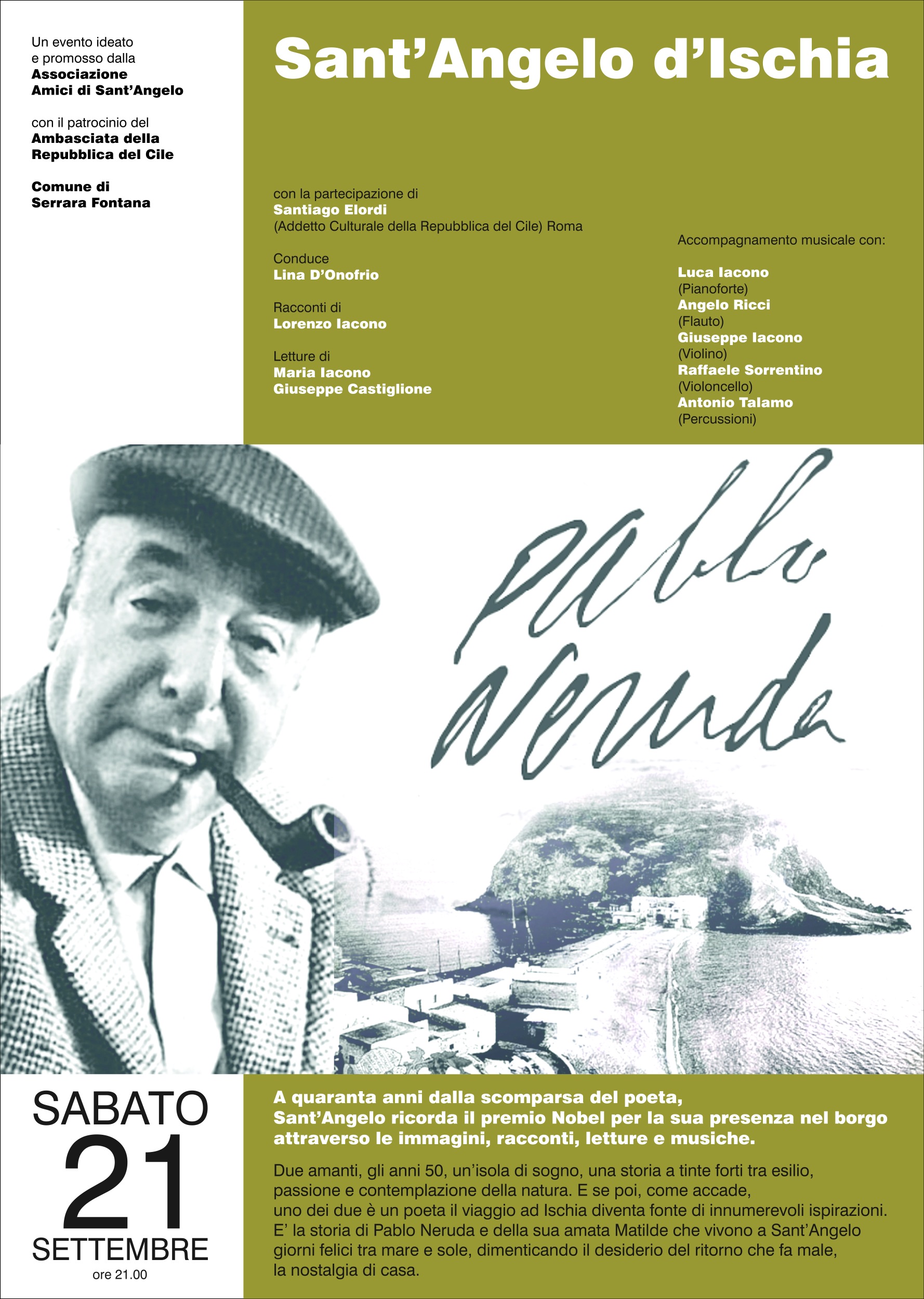 - Sabato 21 - ore 20.30 Tributo a Neruda – Spettacolo Culturale e Musicale A quaranta anni dalla scomparsa del poeta, Sant’Angelo ricorda il premio Nobel per la sua presenza nel borgo attraverso le immagini, racconti, letture e musiche.